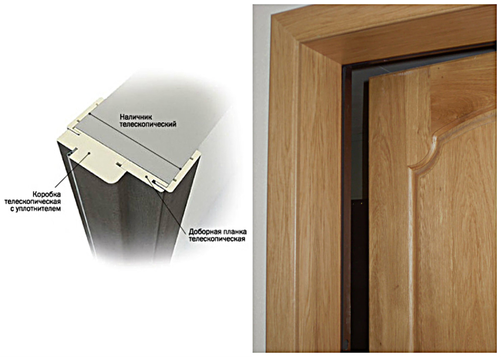 Телескопические рейки считаются универсальными, предусматривают наличие готовых пазов. Их легко наращивать до требуемого размера, адаптировать к ширине проема дверей. В доборную рейку, по виду похожую на пластиковую или деревянную вагонку монтируется телескопический наконечник.